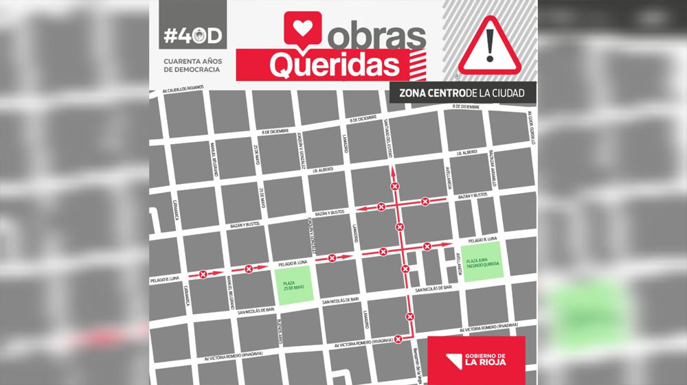 Por tal motivo, se informa que las calles céntricas que se verán interrumpidas esta semana por la obra son: Bazán y Bustos (entre Avellaneda y Lamadrid), Santiago del estero (entre Juan Bautista Alberdi y San Nicolás de Bari) y Pelagio B. Luna (entre Catamarca y 25 de Mayo - con paso continuo al sur por Manuel Belgrano - y Joaquín V. González y Avellaneda – con paso hacia el norte por Lamadrid-).