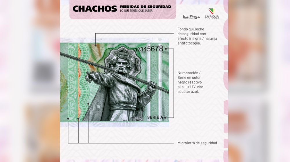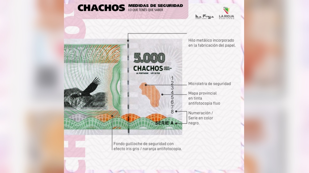 Los Chachos cuentan con diversos elementos de seguridad, entre ellos papel de seguridad sin fluorescencia, con fibrillas visibles e invisibles, marca de agua exclusiva y de fabricación registrada.
