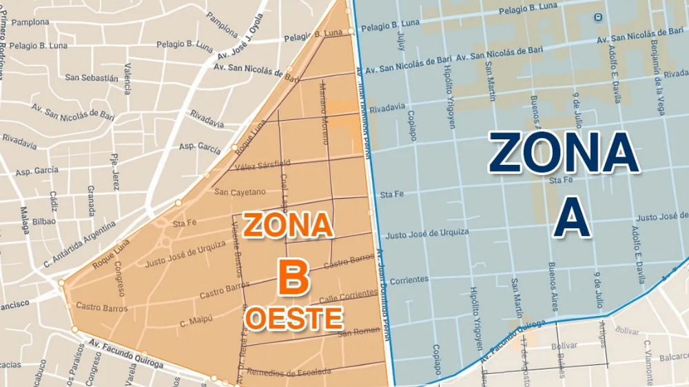 Según la información oficial, la Zona B queda delimitada por avenida J. F. Quiroga —en ambas manos— desde avenida Perón hasta calle Málaga, luego hacia Roque A. Luna (inclusive) y continuando hasta Bazán y Bustos.