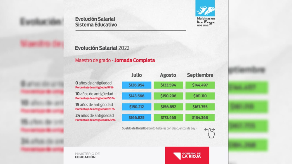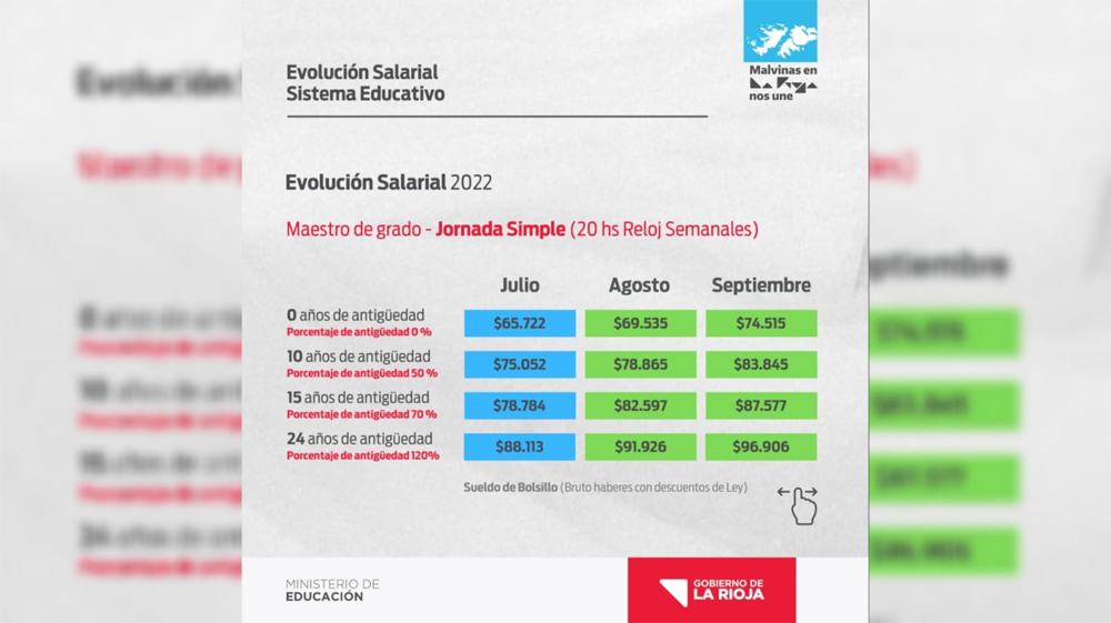 Asimismo, el ministro detallo la evolución que tuvo el salario docente desde enero con los distintos aumentos otorgados al sector; “6.500 pesos en enero, 5.500 en febrero, 5.000 pesos genuinos y al básico entre marzo y abril, mayo el único mes donde no hubo aumento; pero si en junio 5.000 y en julio 6.000; eso sería 28.000 pesos por cargo más sumado a los 4.000 acordados para agosto y los 6.000 para septiembre; lo que nos da la suma de 38.000 pesos de incremento salarial hasta septiembre o sea el 60% de aumento”.