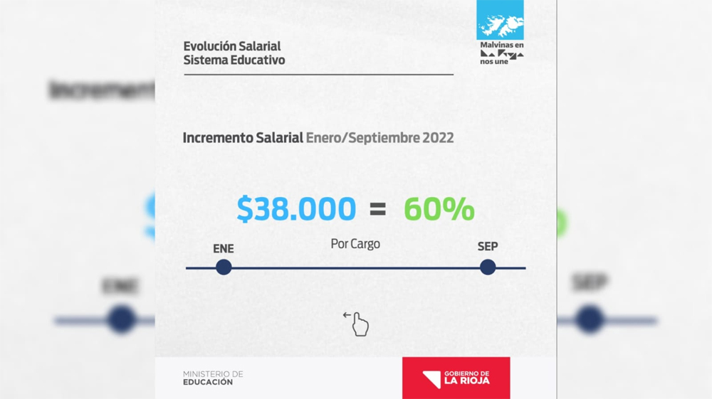 Asimismo, aclaró que este aumento se suma a los ya acordados en el marco de la paritaria “tuvimos 5 mil pesos en junio que se cobró en julio, 6 mil pesos en julio que es lo propuesto hoy por el gobernador por fuera de la paritaria, 4 mil pesos para agosto -que se cobrarían en septiembre -y 6 mil para septiembre -a cobrarse en octubre”. Con todo esto dijo “entre enero y septiembre el sector docente recibirá 38 mil pesos de aumento por cargo, lo que significa un 60% de incremento salarial”.
