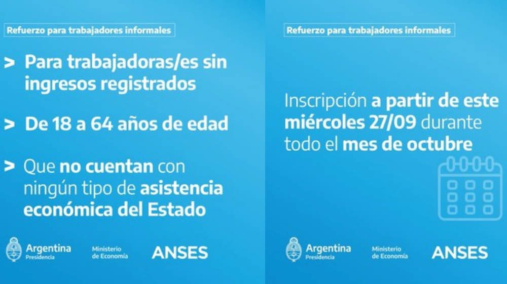 Señaló que el beneficio es para trabajadores/as informales de entre 18 y 64 años, sin ingresos registrados ni asistencia económica del Estado como AUH, Becas Progresar o Potenciar Trabajo. La inscripción se realiza desde hoy a las 14 a 22 horas a través de http://anses.gob.ar o de la app Mi ANSES.