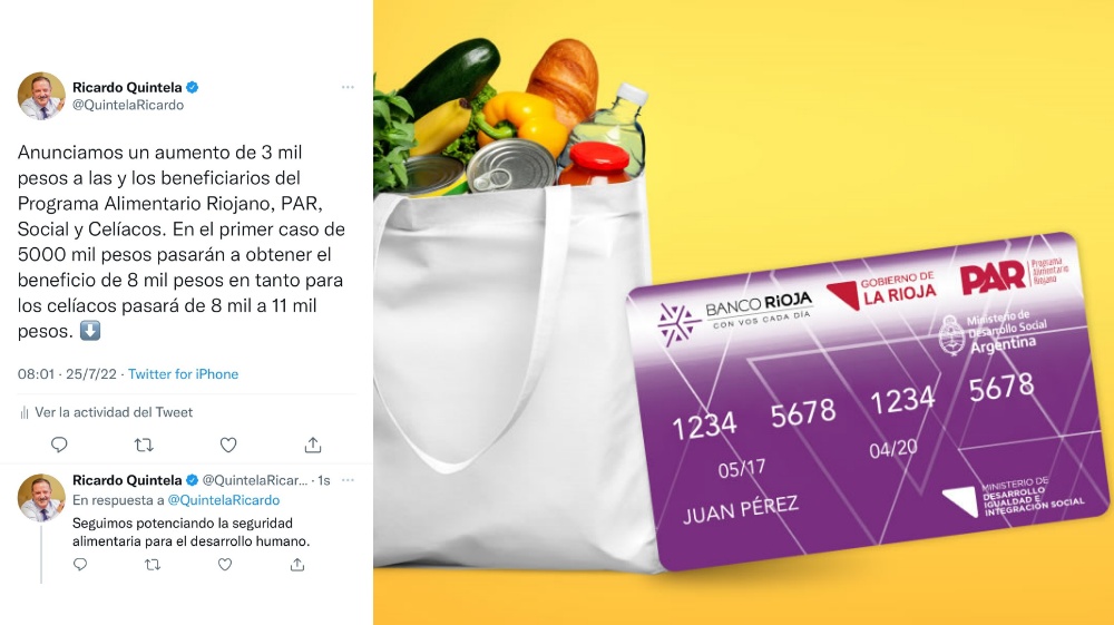 El gobernador anunció este lunes, un aumento de 3 mil pesos para los beneficiarios del Programa Alimentario Riojano, PAR, Social y Celíacos.